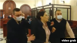 Сегодняшнее судебное заседание началось со скандала. Депутат парламента Тако Чарквиани потребовала прекратить судилище над «реформатором-президентом», после чего ее выдворили из зала.